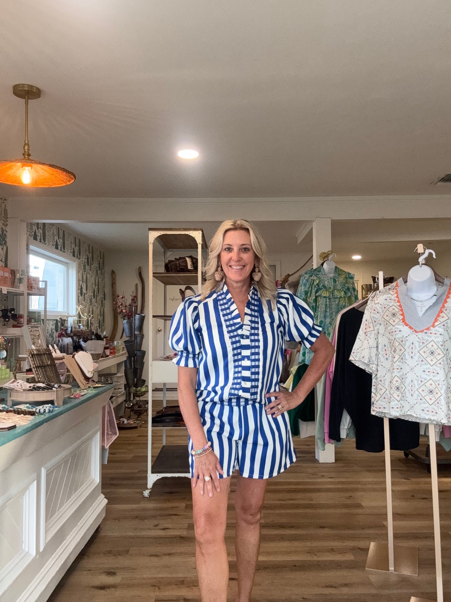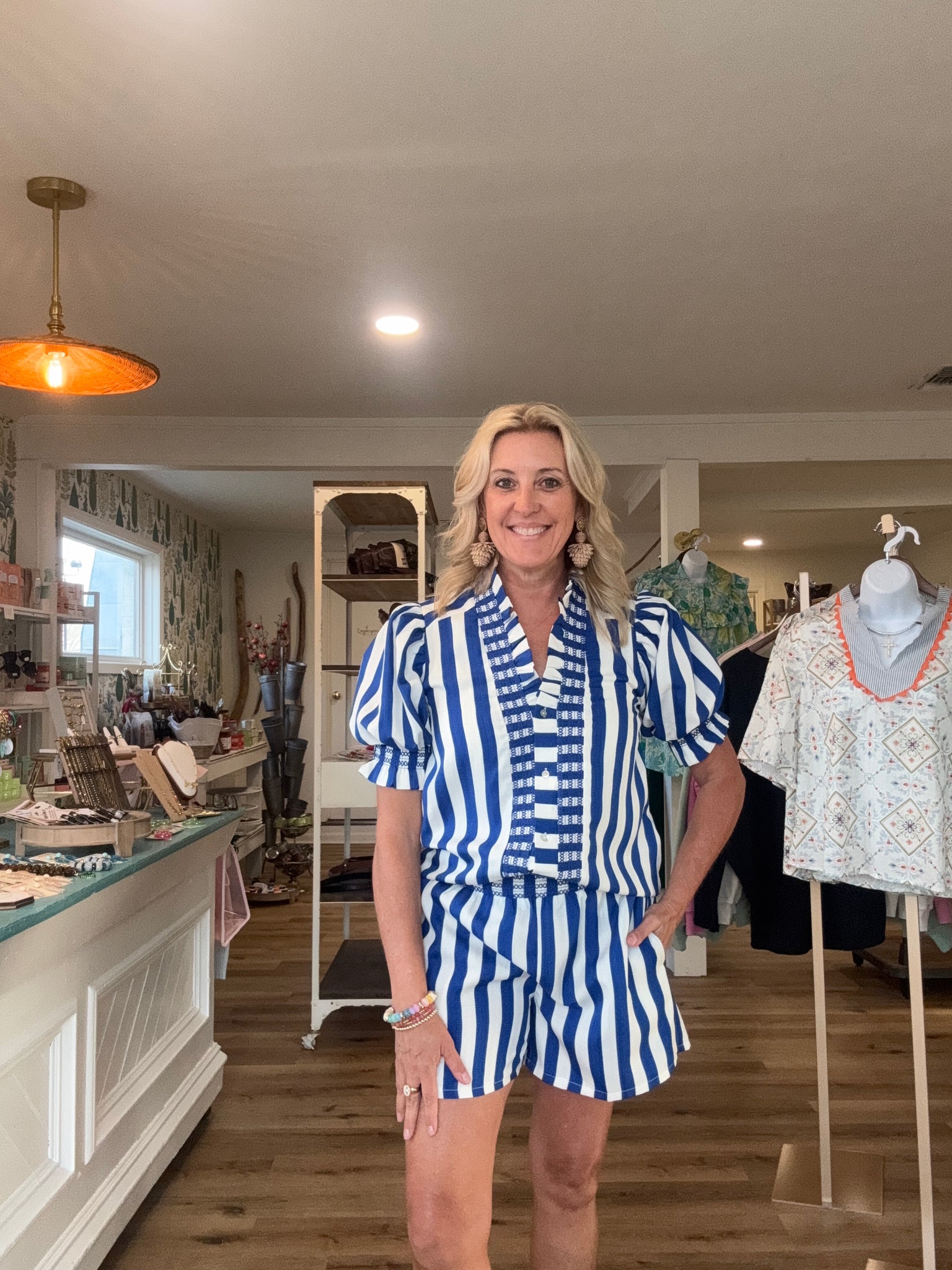 Sooo very cute! Wear together or as separates. Polyester. Shorts elastic waistband and has pockets. I’m in a small.