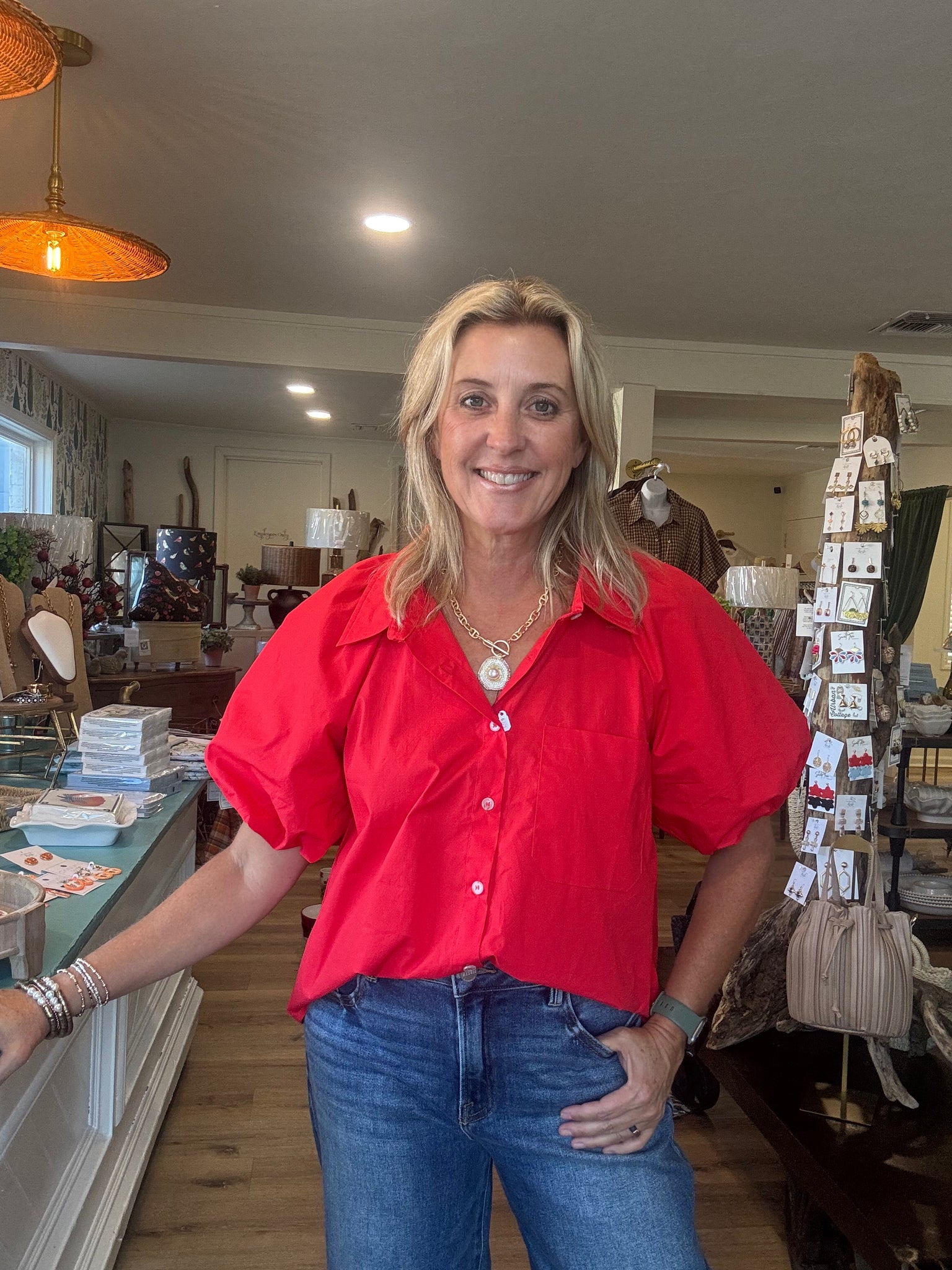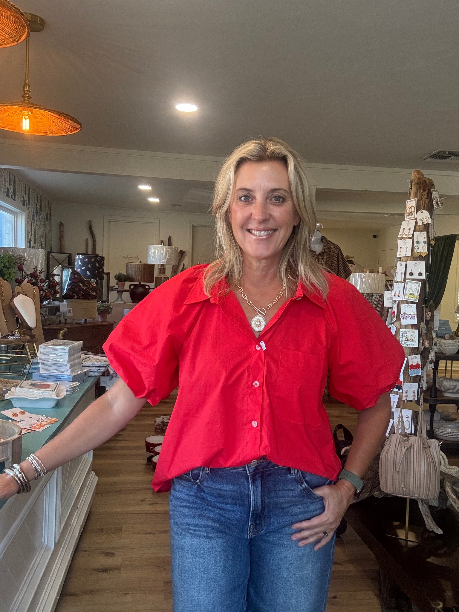 The prettiest color red. Puff sleeves and has a collar. Poplin material. I’m in a medium but could wear a small.