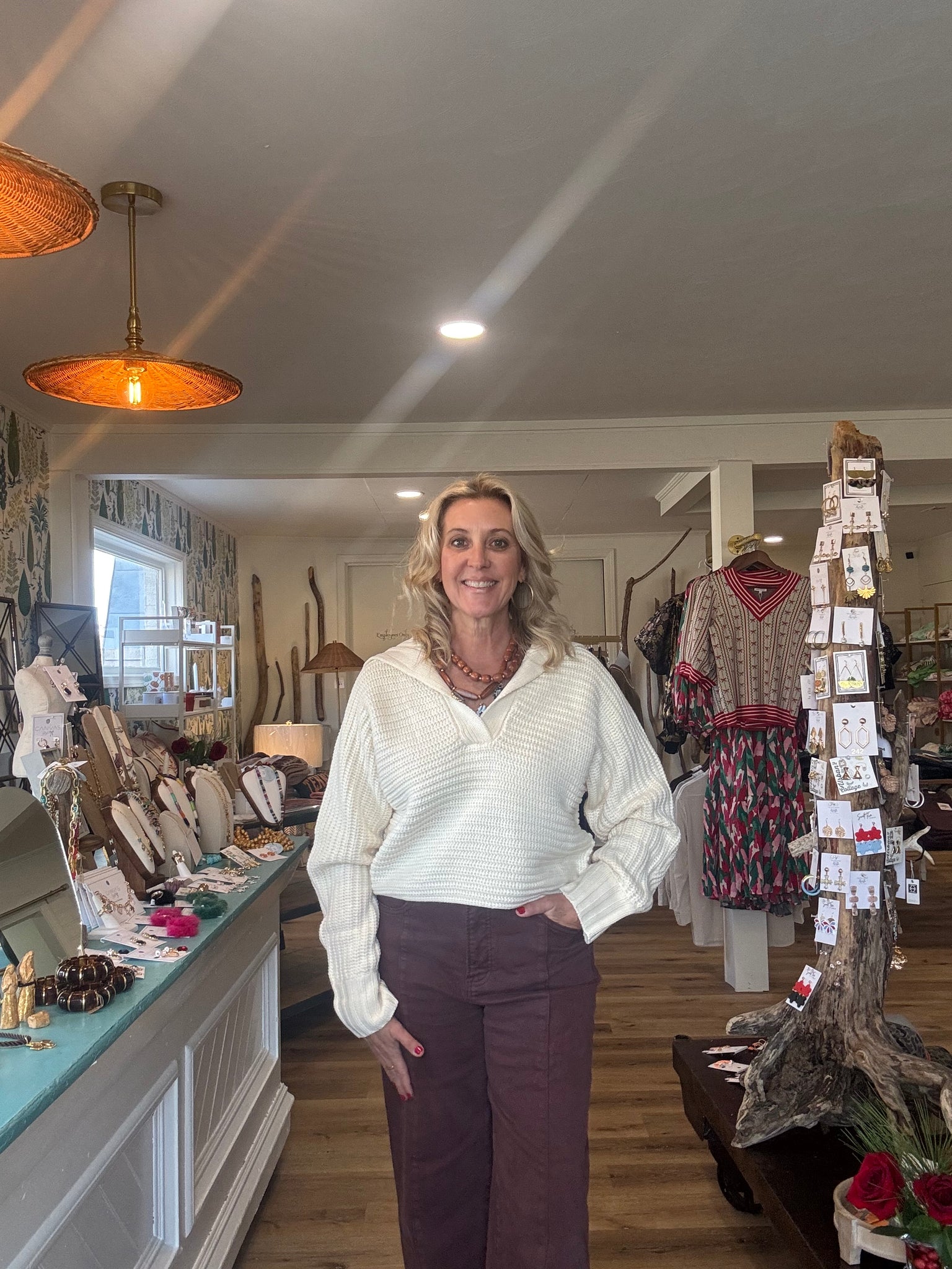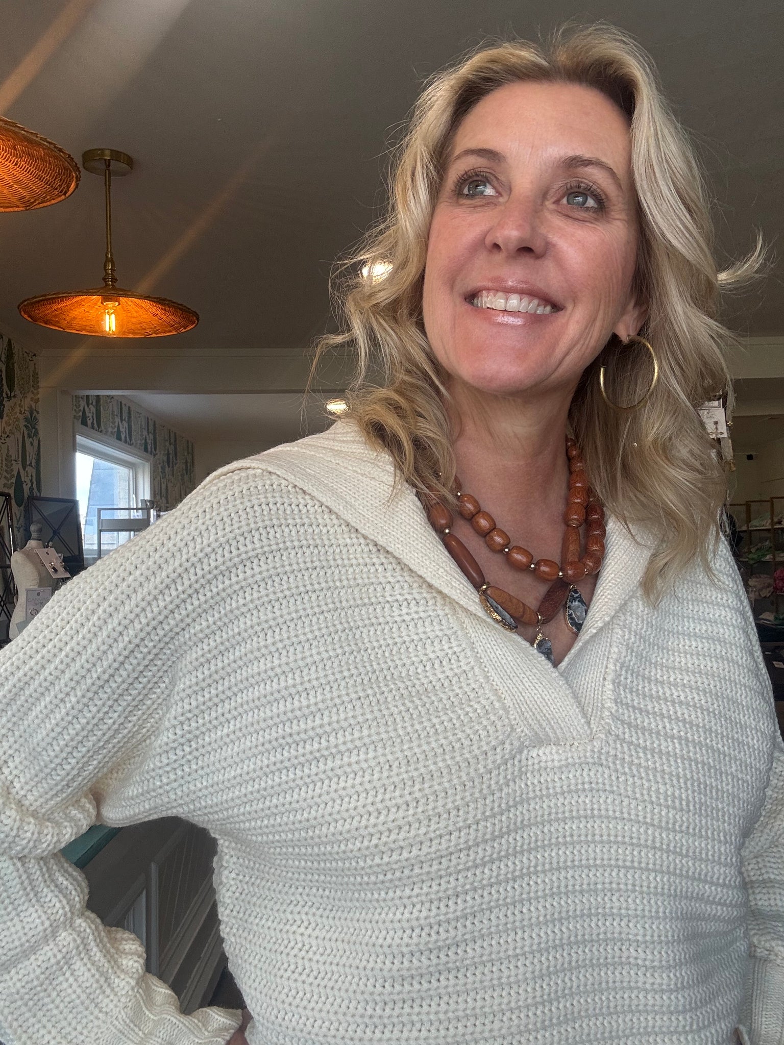 Love the style and neutral color. Cute with a scarf to. Acrylic. I’m in a small.
