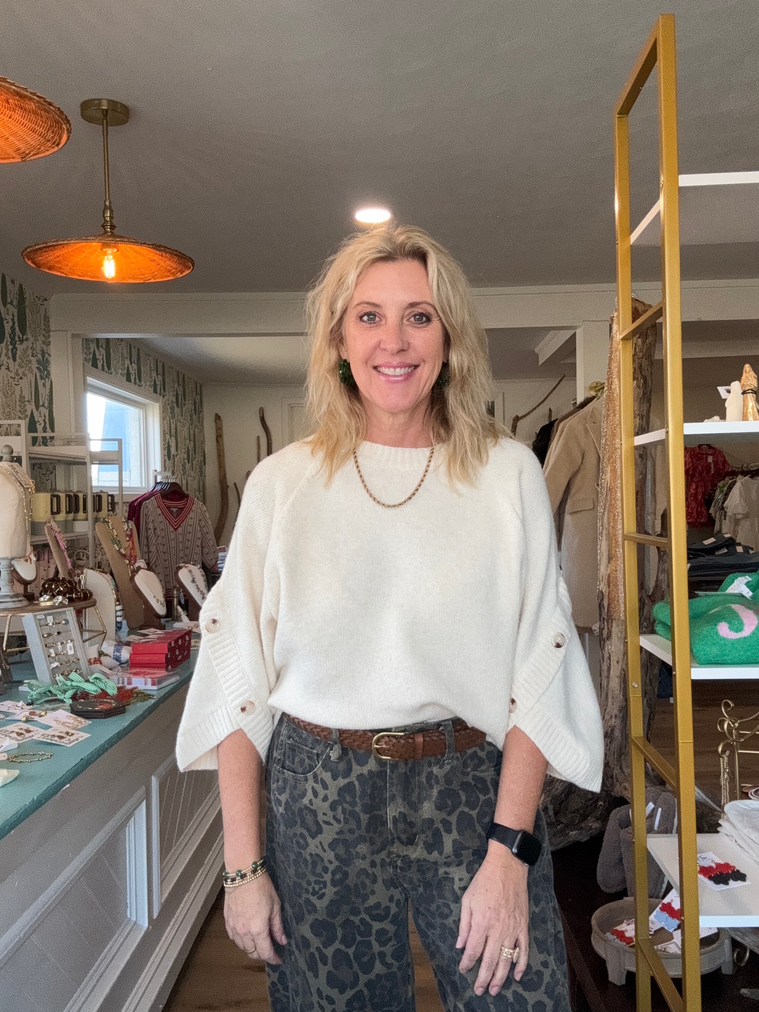 Acrylic, polyester and spandex. I’m in a small for reference. Super cute button and sleeve detail and lightweight and super soft.