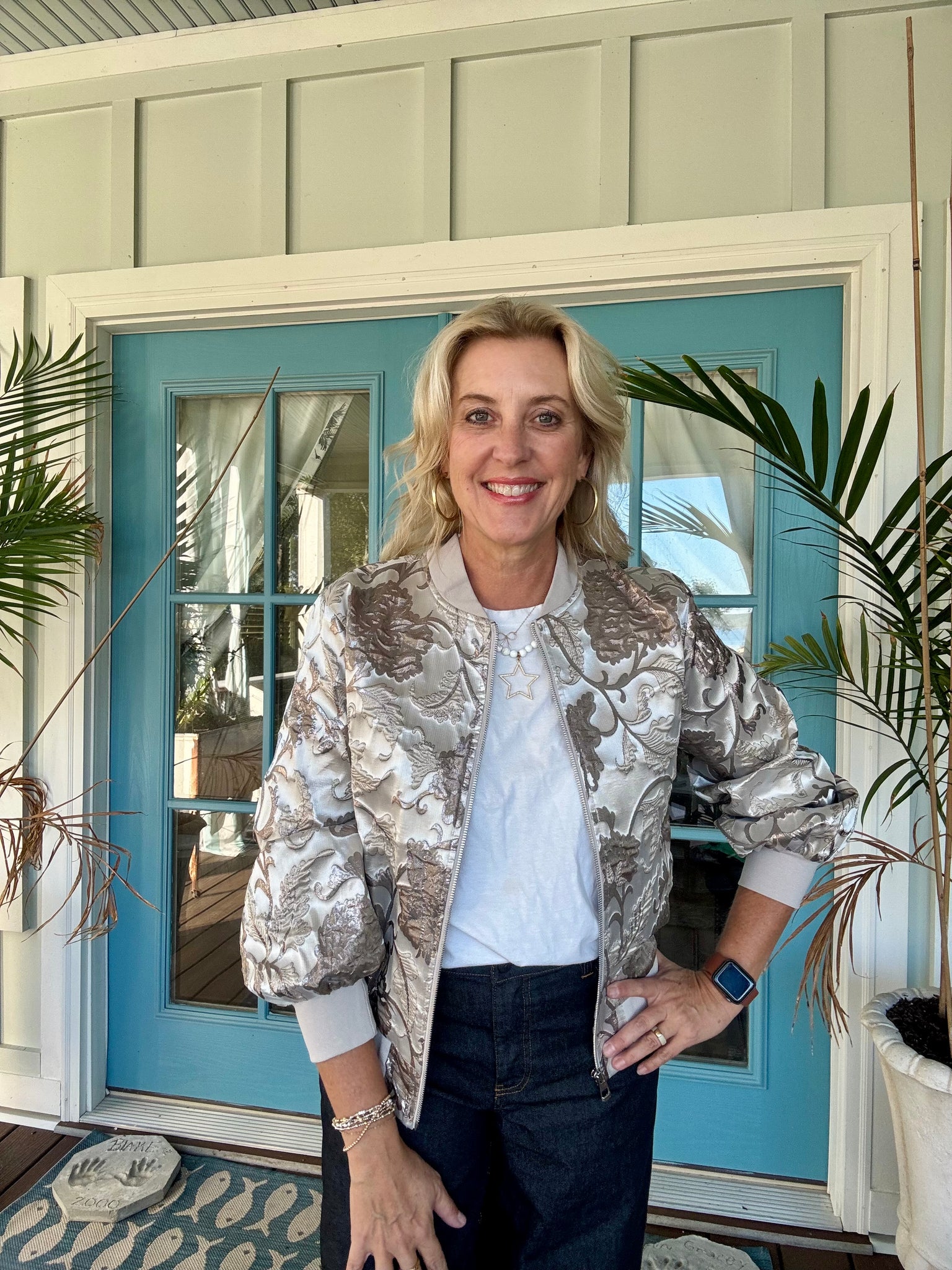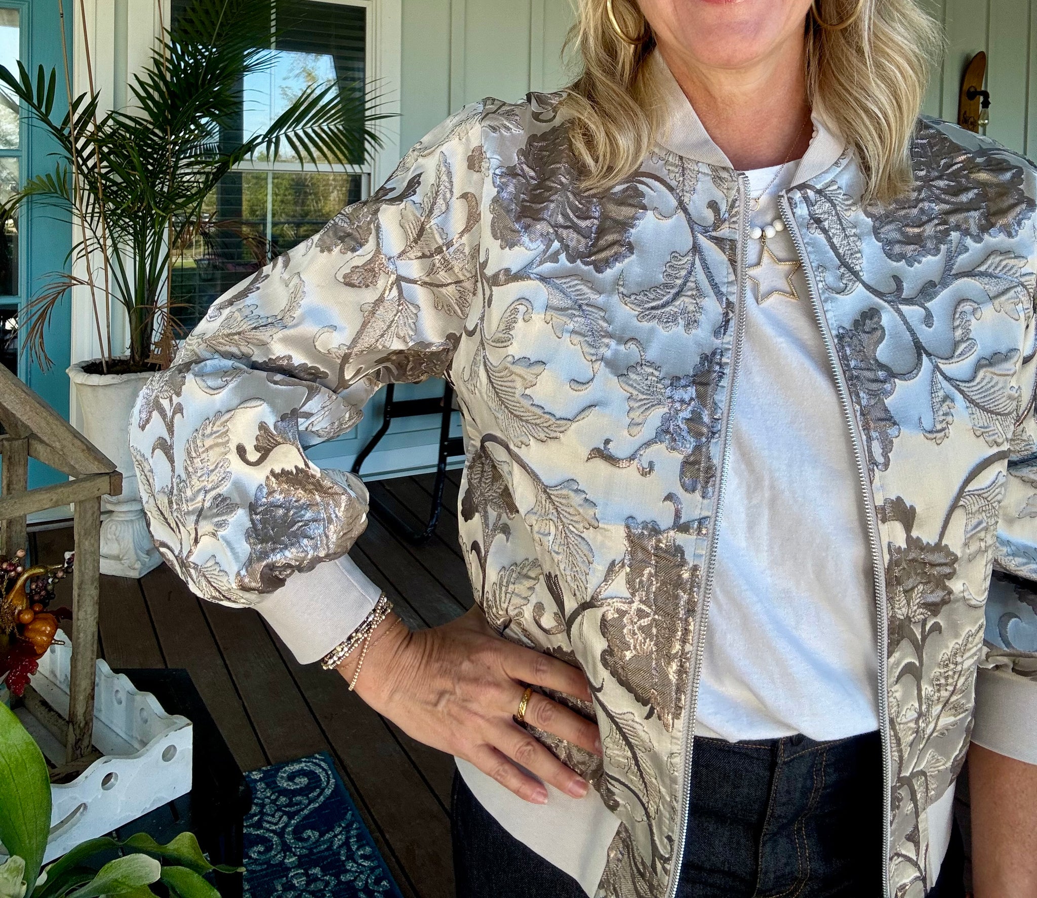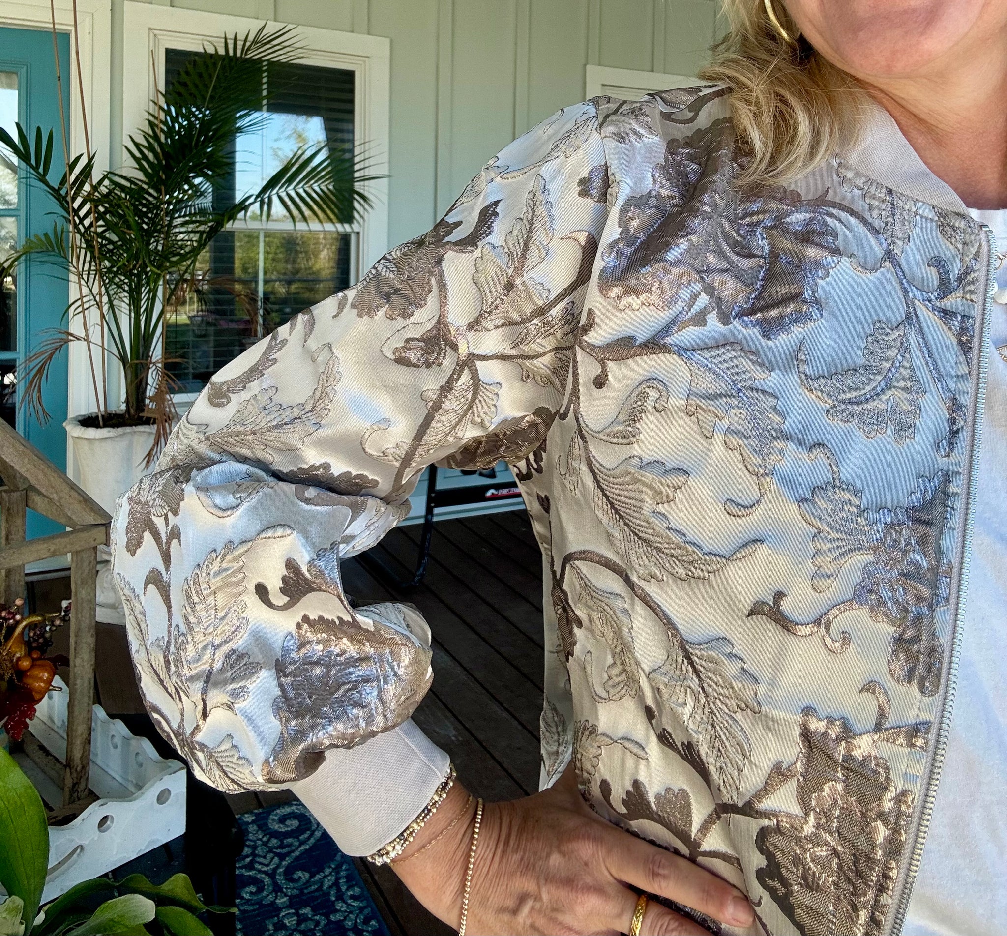 The most beautiful, unique jacket. I’m in a medium. Zip up in the front.