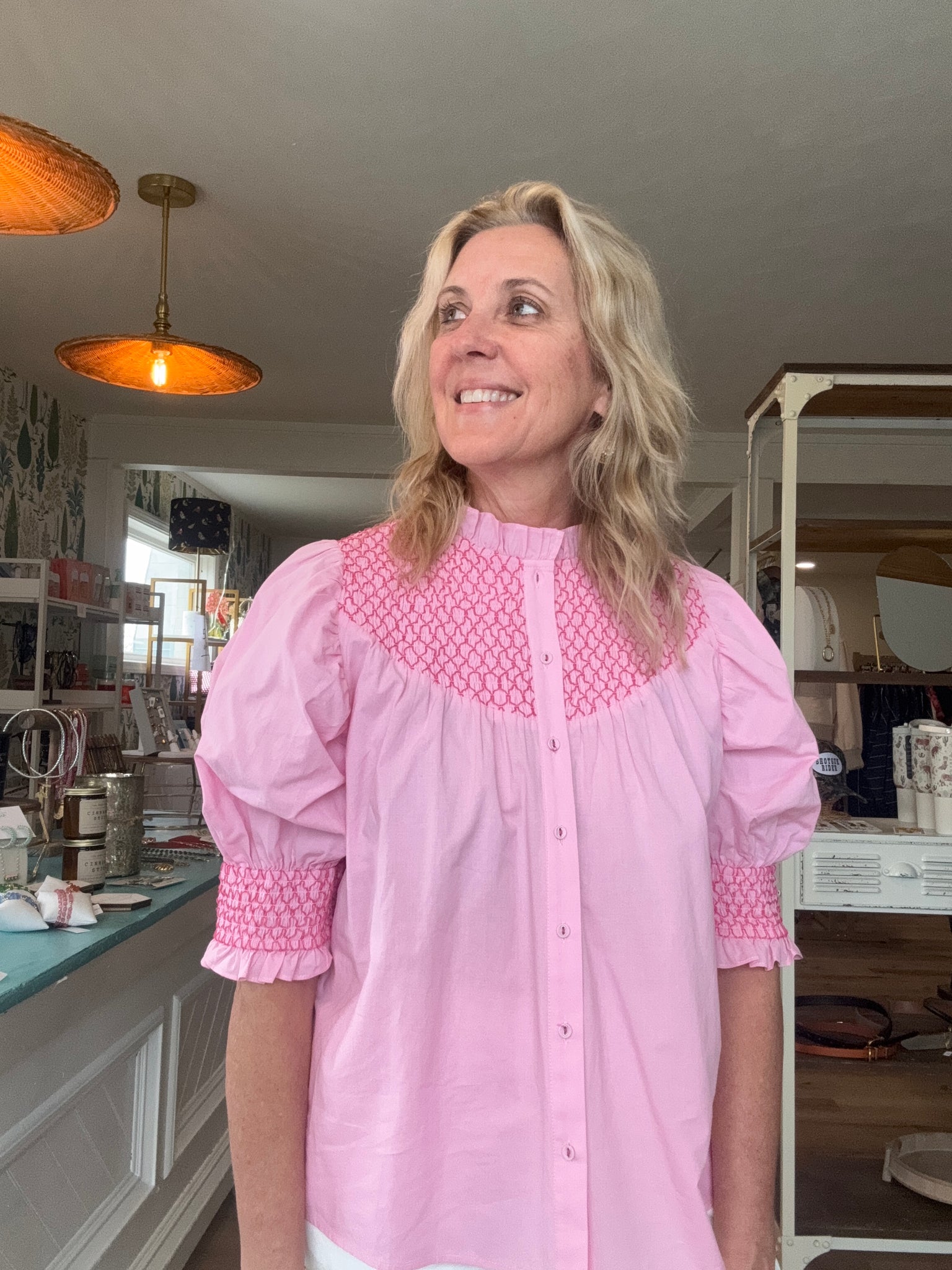 The detail with the hot pink smocked stitching makes this top unique and beautiful. I’m in a small. Cotton.
