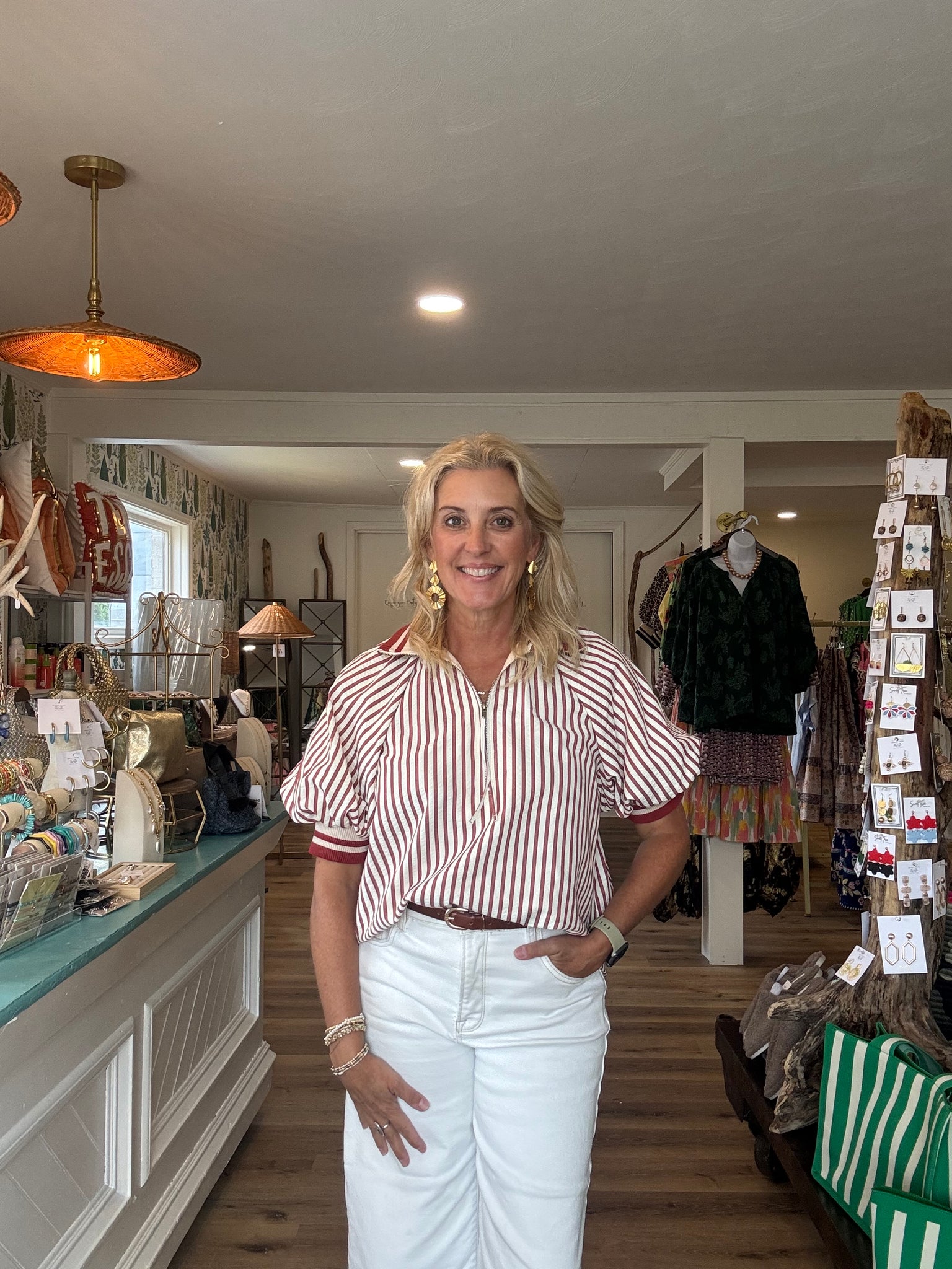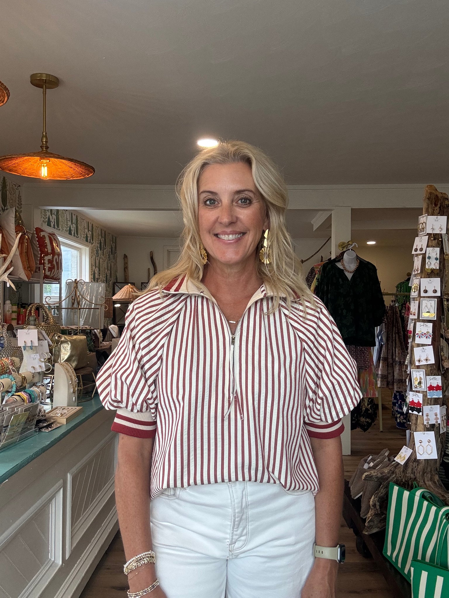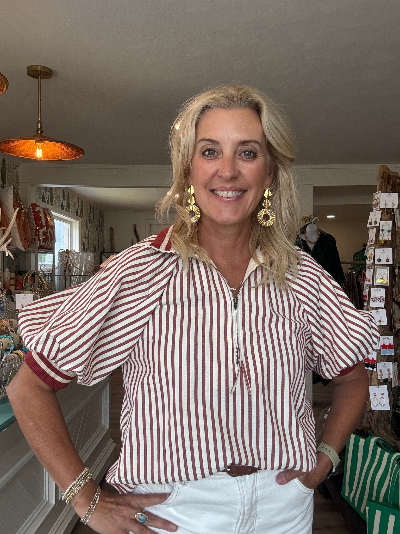The cutest transitional top. A pretty rust colored stripe. Love the sporty collar and arm cuff detail. 1/4 zip. I’m in a small for reference. Cotton/polyester blend.