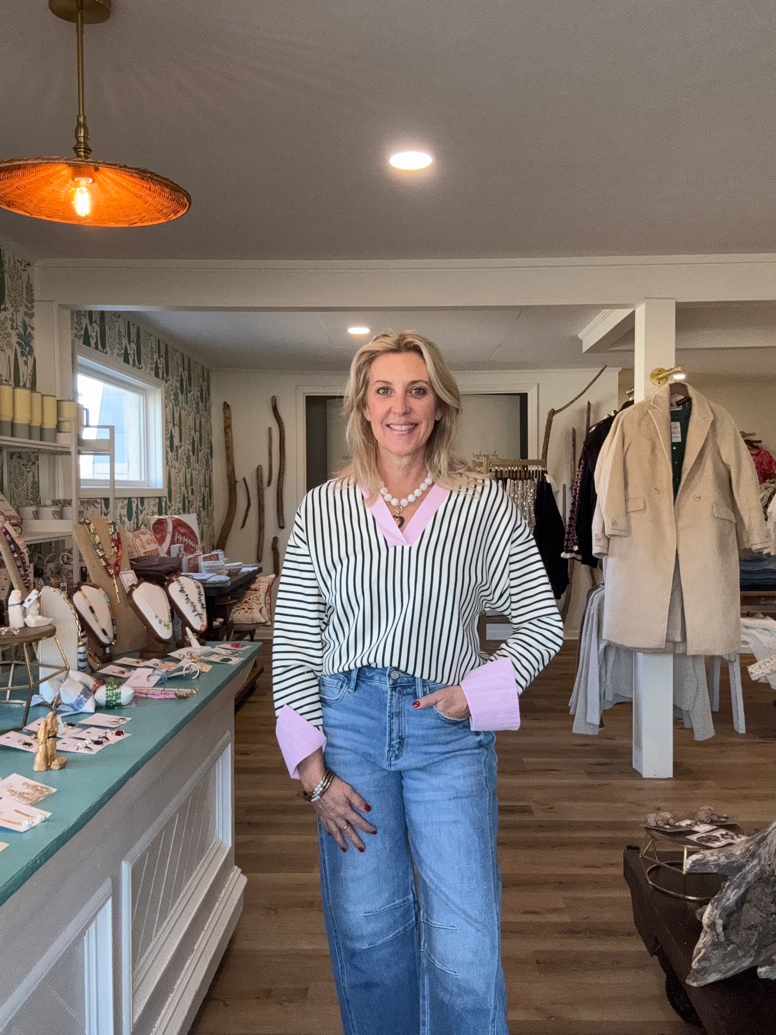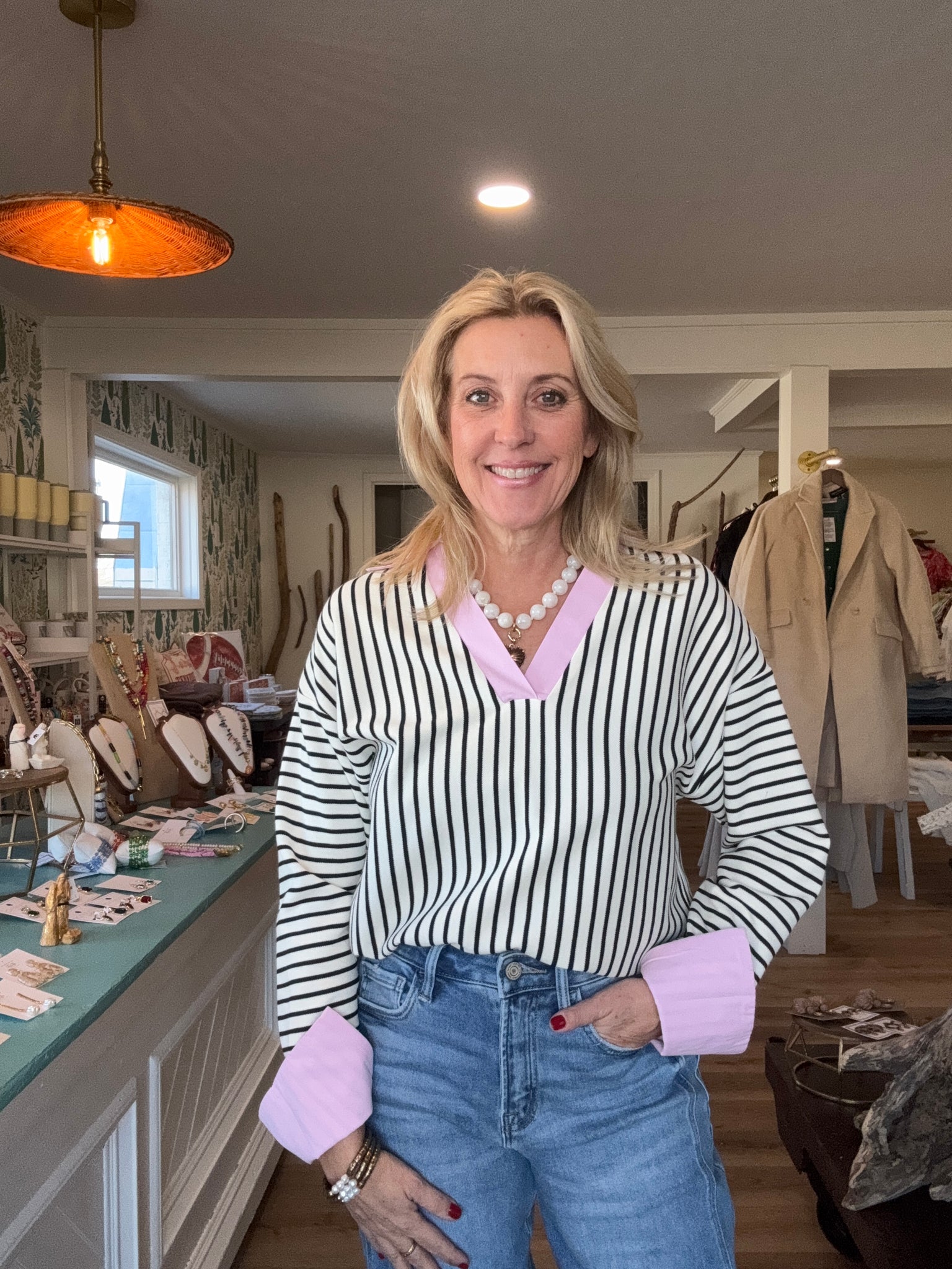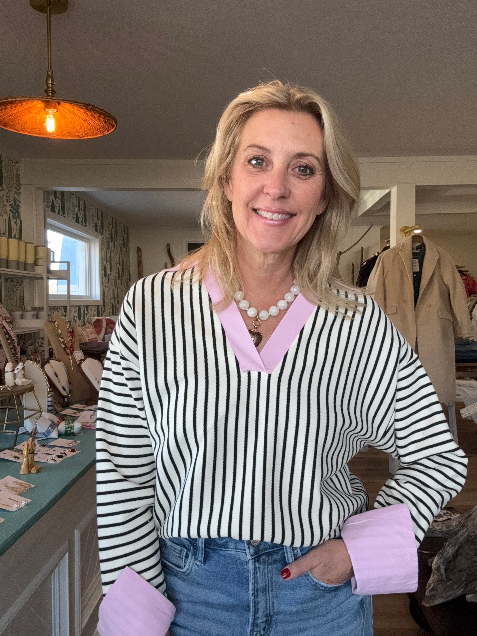 Polyester and cotton blend. The cutest top! I’m in a small for reference. The cutest pink detail.