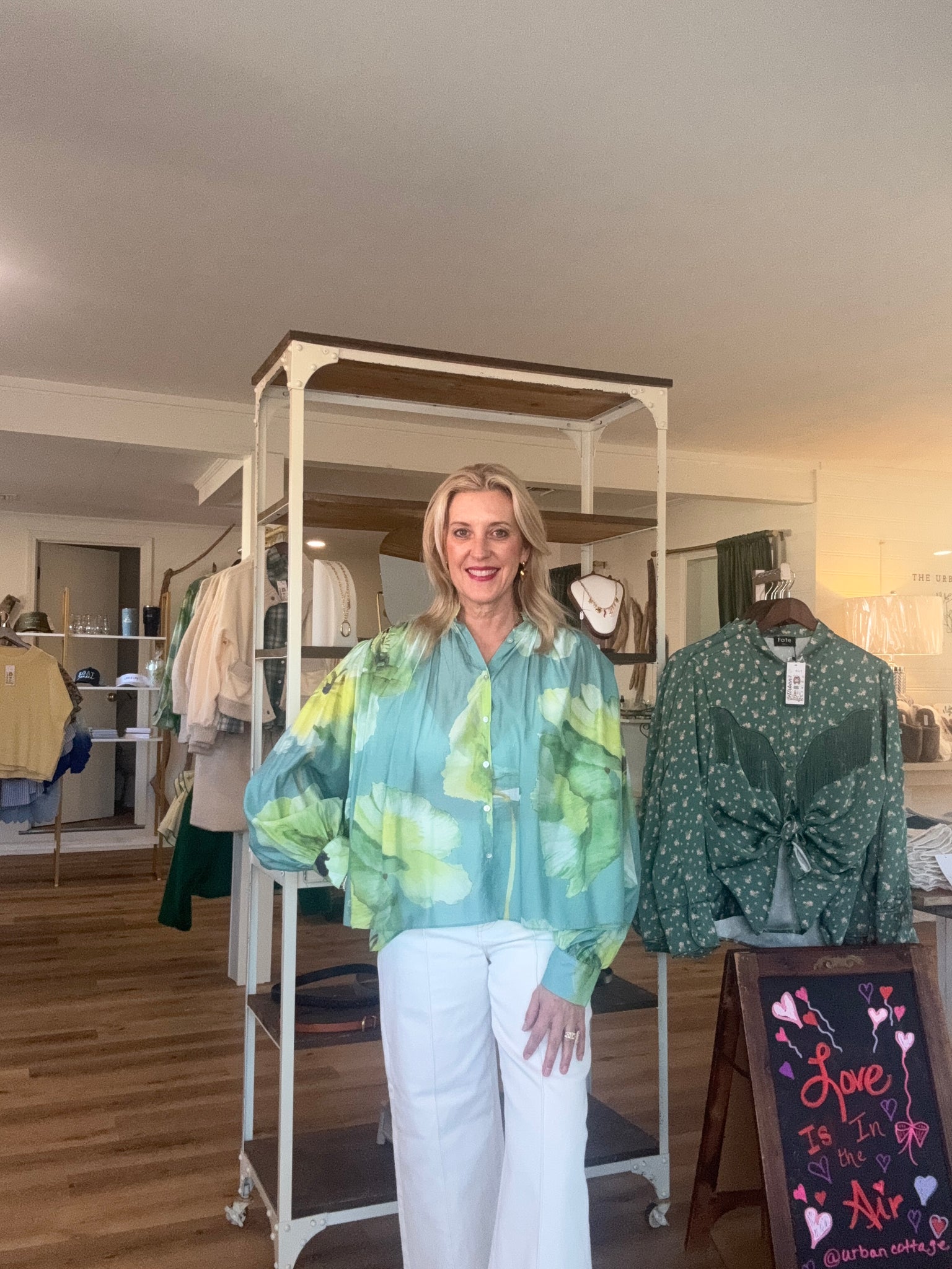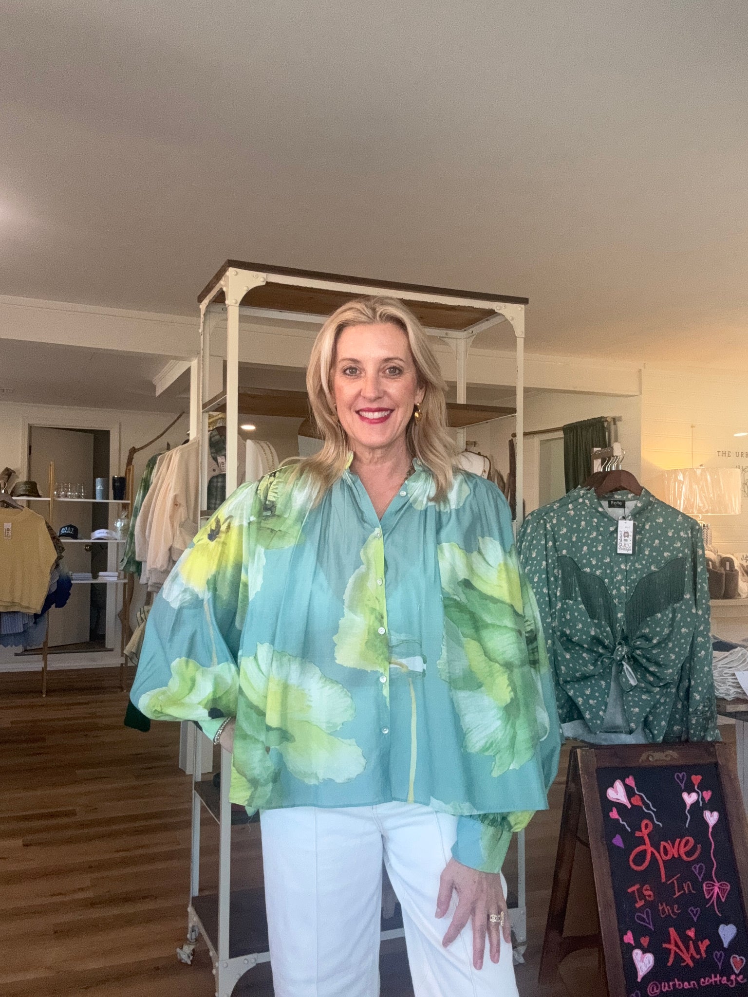 The most beautiful color combination. I’m in a small. Glowy and a super cute pleated back. Polyester.